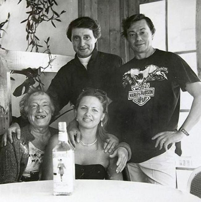 Иннокентий Смоктуновский, Вениамин Смехов c женой Галиной Аксёновой, Николай Караченцов и бутылка джина, во время съемок фильма «Ловушка для одинокого мужчины», Ялта, 1989