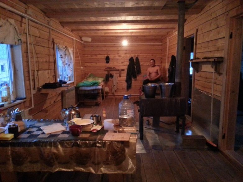 Дом рабочих: Дом перенесли, электричество от генератора подключили, печку поставили, временные кровати сделали, и теперь можно жить.