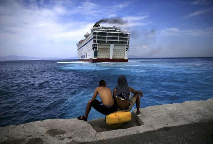 Сирийские беженцы смотрят на пассажирское судно «Элефтериос Венизелос», которое станет регистрационным центром.