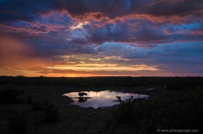 Носорог на водопое. Снимок сделан в национальном парке Этоша в Намибии. Для этого фотографу Йохану Жорже пришлось 7 часов прождать носорога в кустах.