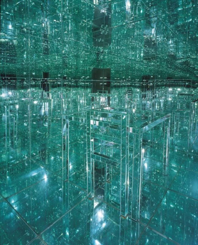 Комната с зеркальными стенами, потолком и полом, обставленная прозрачной мебелью.======
