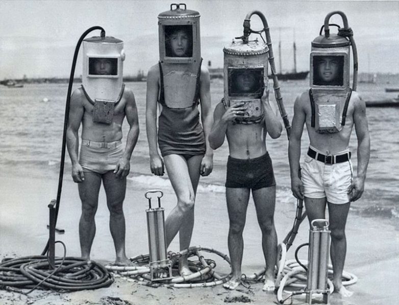 Экипаж подводной лодки в скафандрах, 1908 год.