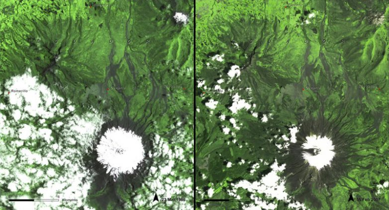 6. Таяние льда на вулкане Котопа́хи (Эквадор). Фото 1987 и 2007 года