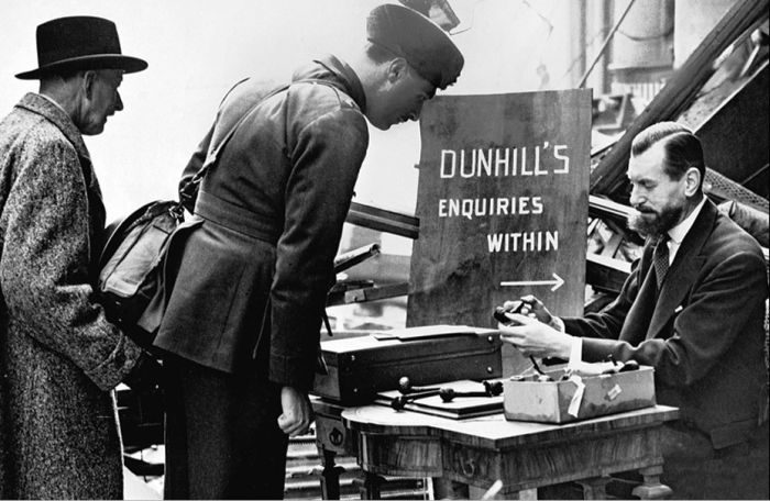 Альфред Данхилл продает трубки на улице перед руинами своего магазина, Лондон, Англия, 1944 г.