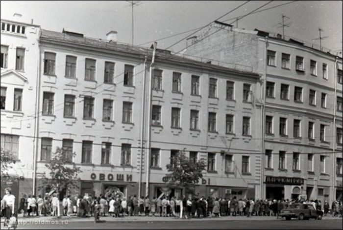 Очередь за мылом, снятая от «Ильичёвского» магазина в мае 1989 года. И надпись над очередью «Овощи».