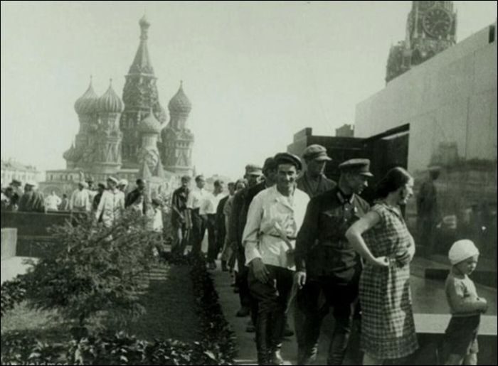 Угол Октябрьской площади и Коровьего вала 1935 год. Очередь за едой.