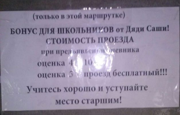 Александр Каширцев — а для детей просто дядя Саша — не только крутит баранку своей «Газели», но и проверяет дневники, как настоящий классный руководитель. Стоимость проезда по его тарифам составляет: за оценку «4» в дневнике — 10 рублей вместо 17, а за «5» — бесплатно!