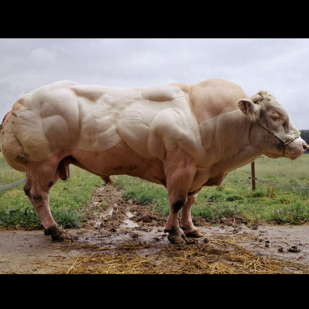 Специально выведенный бык породы бельгийская голубая с хорошо развитой мускулатурой и низким процентом подкожного жира.