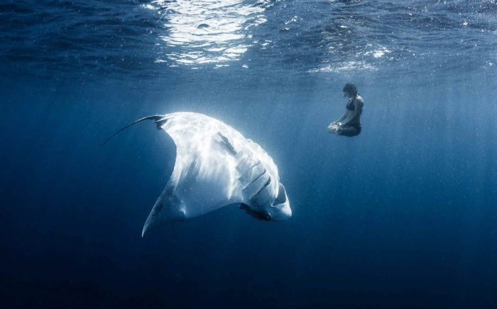 Женщина занимается подводной йогой прямо напротив ската весом в 1500 фунтов (680 кг).