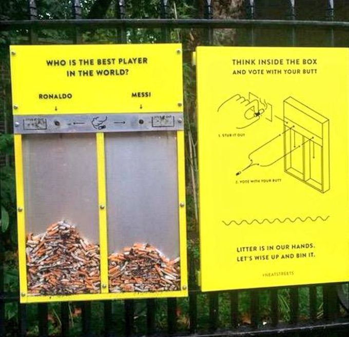 Отличный способ мотивировать курильщиков не выкидывать окурки куда попало. В данном случае с их помощью можно проголосовать за лучшего футболиста в мире.