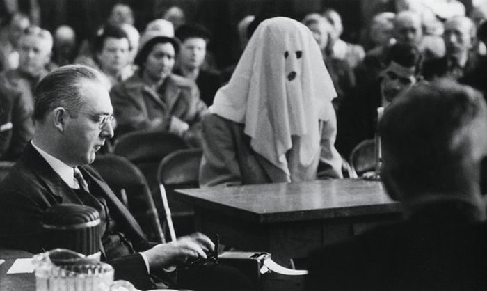 Замаскированный секретный свидетель даёт показания в зале суда по делу о наркотиках. Вашингтон, 30 апреля 1952 года.