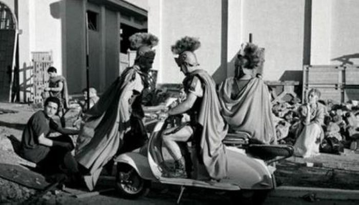 Актеры играющие римских центурионов знакомятся со скутером. Съёмки фильма «Бен–Гур». 1959 г.