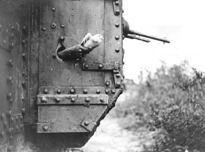 Член экипажа британского танка Mark I выпускает почтового голубя через бойницу. 1918 год