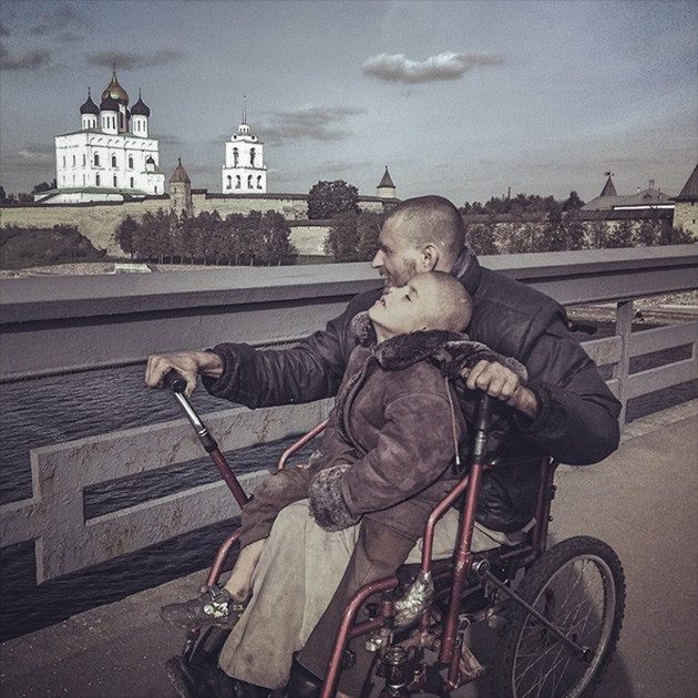 Своим любимым кадром Дмитрий называет снимок одинокого отца на коляске и с сыном. «Это история, которая для меня продолжалась полгода: мы пытались устроить судьбу этого семейства. Мальчишка загремел тогда в приют, и отец остался один. Сейчас вроде все наладилось», — рассказывает Дмитрий.