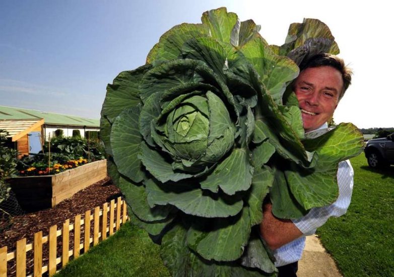 Директор выставки «Autumn Flower Show» 2011 года, Мартин Фиш, позирует с огромной капустой.