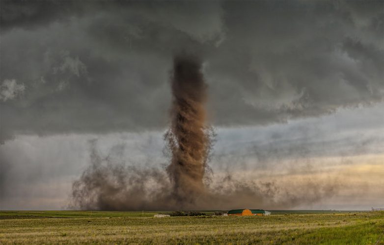 Потрясающий редкостный антициклонический торнадо приближается к дому среди полей вблизи городка Симле, штат Колорадо, 5 июня 2015. Автор фото: Джеймс Смарт