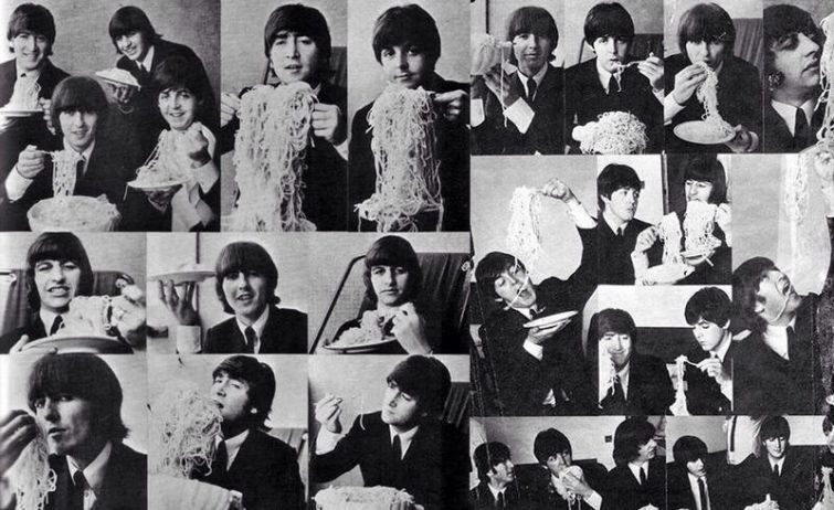 The Beatles поедают спагетти во время визита в Италию, 1965 г.
