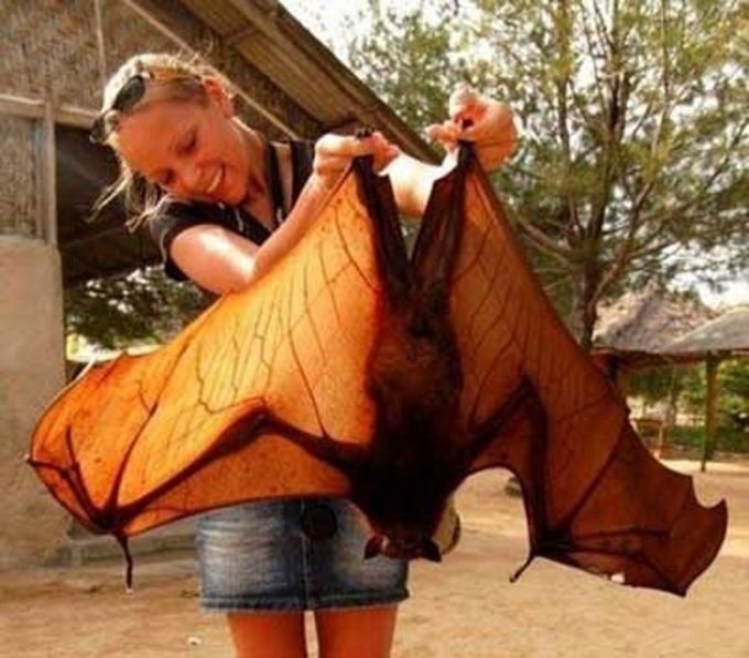 А это летучая лисица. Она, в общем, травоядная, но страх почему-то навевает...