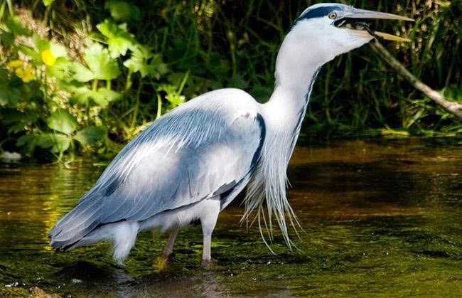 Серая цапля поймала утенка и проглотила его целиком в реке Доддер в Дублине.