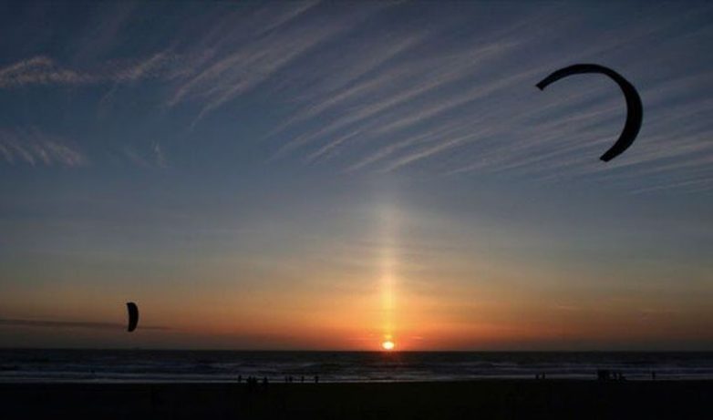 Свидетелями световых (или солнечных) столбов мы становимся достаточно часто. Так называется распространённый вид гало. Этот оптический эффект выглядит, как вертикальная полоса света, которая тянется от солнца при закате или восходе. Световой столб можно наблюдать, когда свет в атмосфере отражается от поверхности мельчайших кристаллов льда, имеющих форму ледяных пластин или миниатюрных стержней с 6-угольным сечением. Кристаллы подобной формы образуются чаще всего в высоких перисто-слоистых облаках. Но если температура воздуха достаточно низкая, они могут появляться и в менее высоких слоях атмосферы. Думаем, не стоит объяснять, почему световые столбы чаще всего наблюдаются в зимний период.