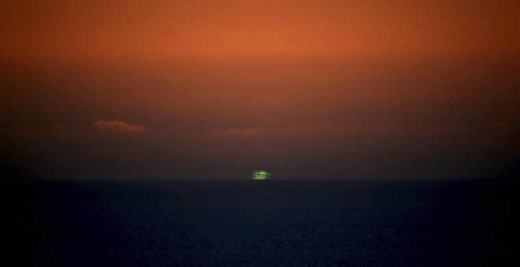 Исключительно редкий оптический эффект проявляется как вспышка зеленого, реже синего света в момент исчезновения солнечного диска за горизонтом (или появления над горизонтом), чаще морским. Продолжительность вспышки — от одной-двух секунд до пяти минут. Хотя в истории зафиксирован уникальный случай. Во время одной из экспедиций к Южному полюсу американский летчик и исследователь Р. Бэрд наблюдал зеленый луч в течение 35 минут! Это случилось в конце полярной ночи, когда край солнечного диска в первый раз появился над горизонтом и передвигался вдоль него.