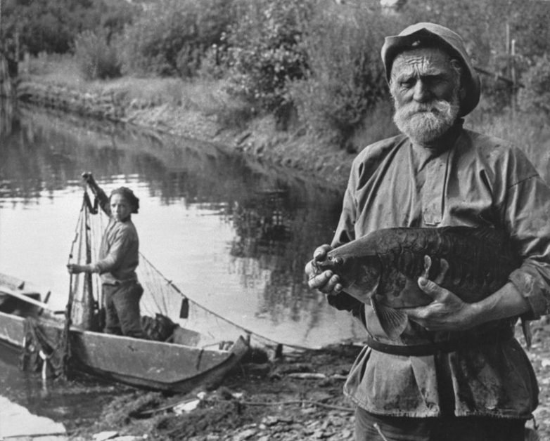 Ловец жемчуга на Миссисипи готовится к очередному заходу на дно. В качестве шлема — старый топливный бак от автомобиля. 1938 г.