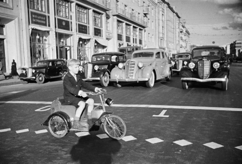 Мальчик на электросипеде (?) пересекает улицу Горького, 1937