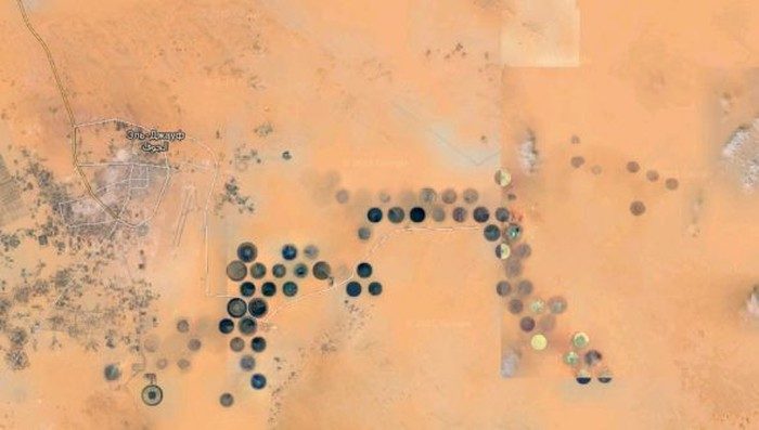Поля, появившиеся благодаря Великой рукотворной реке, хорошо заметны из космоса: на спутниковых снимках они имеют форму ярких зелёных кругов, разбросанных посреди серо-жёлтых пустынных районов. На фото: возделываемые поля вблизи оазиса Куфра.