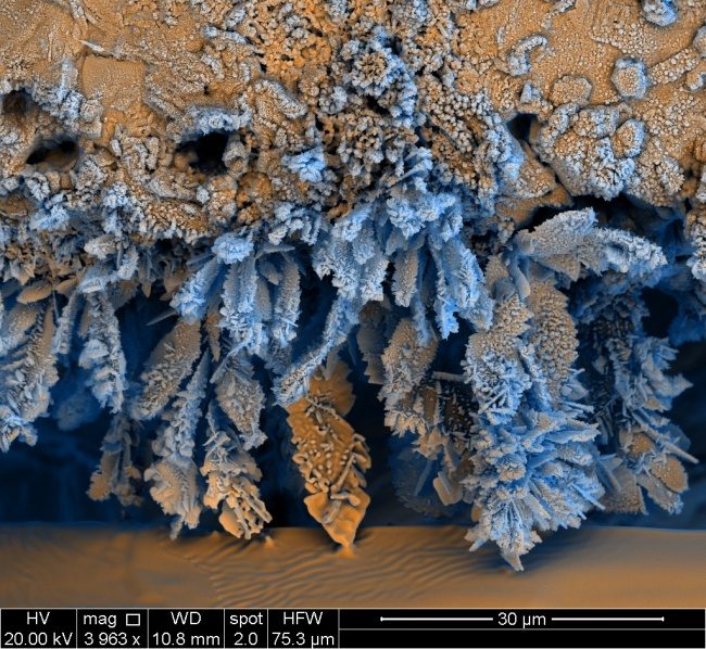 Да, уж! Ресницы и снег (и кое-что другое), видимо, окрашены в неестественные цвета для лучшего восприятия… Странная у мела структура! А мне больше всего понравилась пыль. Жаль, что под снимками не указано увеличение…