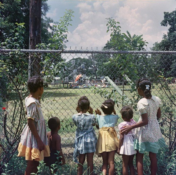 Чернокожие дети наблюдают за играми своих белых ровесников, к которым не имеют права присоединиться. США, 1956 год.