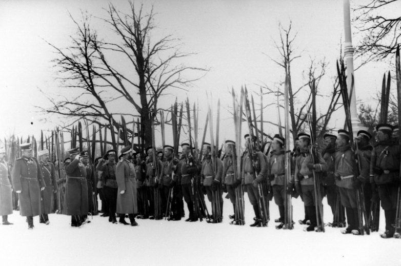 Император Николай II проводит смотр лыжников Лейб-гвардейского Измайловского полка. Царское село, 9 февраля 1914 года.
