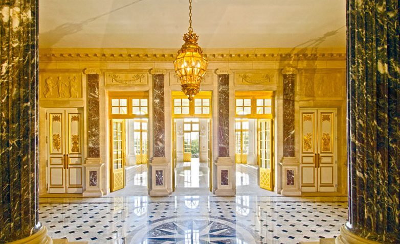 Роскошные интерьеры особняка площадью несколько тысяч квадратных метров богато украшены позолотой и лепниной, мраморными статуями, шелковыми гобеленами и фресками ручной работы. Здесь есть винный погреб, кинотеатр, бассейн и большой подземный аквариум, а в парке проложены дорожки для прогулок верхом, разбит садовый лабиринт и устроен отделанный сусальным золотом фонтан.