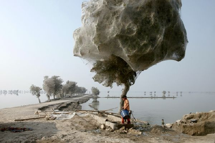 Пауки взобрались на дерево и оплели его паутиной, чтобы спастись от наводнения.