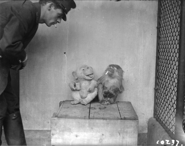 Смотритель зоопарка Джон Уилки на перекуре вместе с обезьянкой и её игрушечным компаньоном, декабрь 1928 года.
