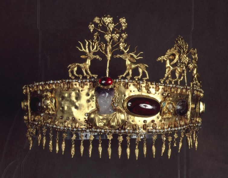Золотая диадема с аметистами, альмадинами, гранатами, бирюзой, кораллами и стеклом, Сармато-аланская культура, I в. н.э.