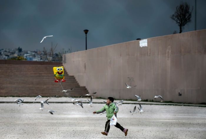 Мальчик-мигрант играет с воздушным шаром в южном пригороде Афин.