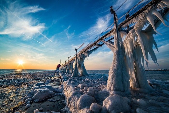 Заледеневший пирс в Гранд Хейвен, штат Мичиган, США