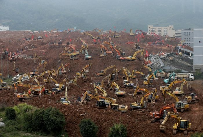 Спасатели в поисках выживших после схода оползня в промышленном парке города Шэньчжэнь. К настоящему моменту около 80 человек числятся пропавшими без вести. Причиной происшествия стало скопление грязи на местной промышленной свалке.