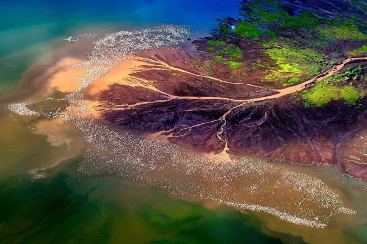 Озеро Богория в Кении, на берегах которого любят бывать фламинго.