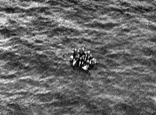 Потерпевшие кораблекрушение на плоту плывут к летающей лодке «Каталина». К сожалению, вода была слишком неспокойной, чтобы «Каталина» смогла приземлиться и забрать людей, поэтому плот затонул вскоре после того как была сделана эта фотография.