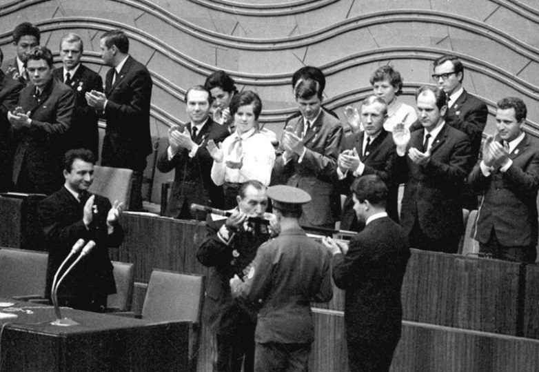 Маршал Советского Союза Семён Михайлович Будённый вручает комсомольцам свою боевую шашку на XVI съезде ВЛКСМ. 1970 год.