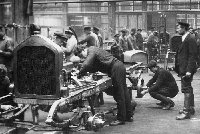 Сборка первых советских грузовиков АМО-Ф-15 в цехах Московского завода АМО, 1924 год