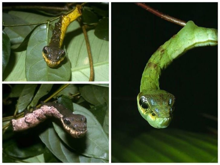 На фото гусеница и ее хвост в виде головы змеи. Так этот вид hemeroplanes маскируется, чтобы отпугивать хищников. Гусеница не ядовита и не кусается.