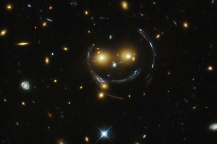 Телескоп «Хаббл» нашел в созвездии Большой Медведицы «смайлик». Подобные «смайлы» возникают в космосе благодаря тому, что свет далеких галактик часто проходит на пути к Земле через набор гравитационных «линз» — уголков космоса, где сила притяжения массивных объектов, темной материи или галактик искривляет лучи света.