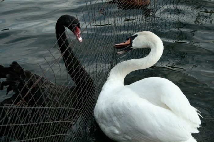 Выглядит, будто грань между добром и злом. На самом же деле на фото черный лебедь — довольно редкая птица!