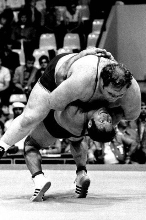 Бросок века. Мюнхен, 1972 г. Немец Вильфрид Дитрих весом в 110 кг кидает 200 кг американца Криса Тейлора на Летних Олимпийских играх 1972 года в Мюнхене, соревнования по греко–римской борьбе.