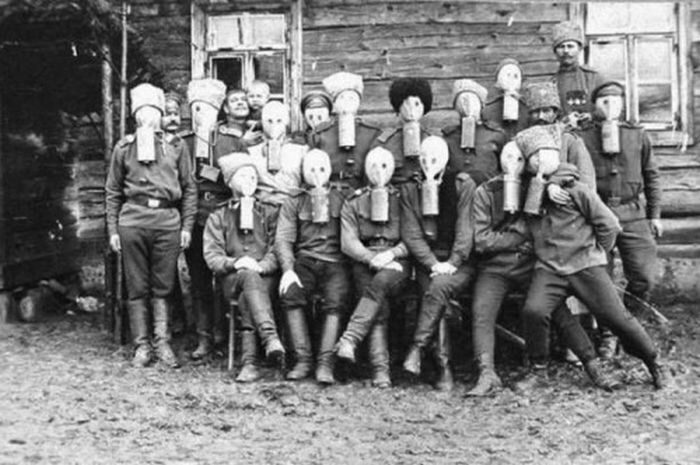 Солдаты в противогазах системы Зелинского–Кумманта, 1916 год, Россия
