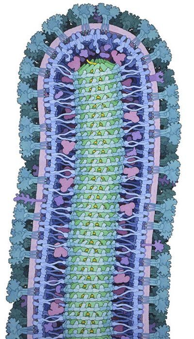 Вирус окружен мембраной (показана розовым и фиолетовым), украденной у зараженной клетки. Мембрана покрыта многочисленными белками вируса (бирюзовый), вытянутыми вовне — они напоминают ветви с корнями и цепляются за другие клетки. Слой белков (синий) укрепляет мембрану с внутренней стороны. РНК (носитель генетической информации) хранится в цилиндре нуклеокапсида (зеленый).