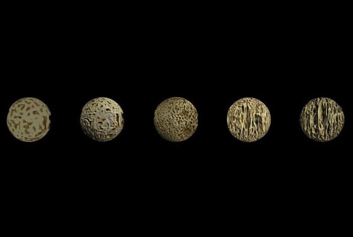 На этой серии снимков показано, как меняется структура кости по мере роста человека. Слева направо: первый поясной позвонок за три месяца до рождения, на момент рождения, в первый год жизни, в 1,2 года, в 2,5 года. Кости из скелетов младенцев, умерших в XIX веке, были взяты из коллекции Королевского хирургического колледжа.