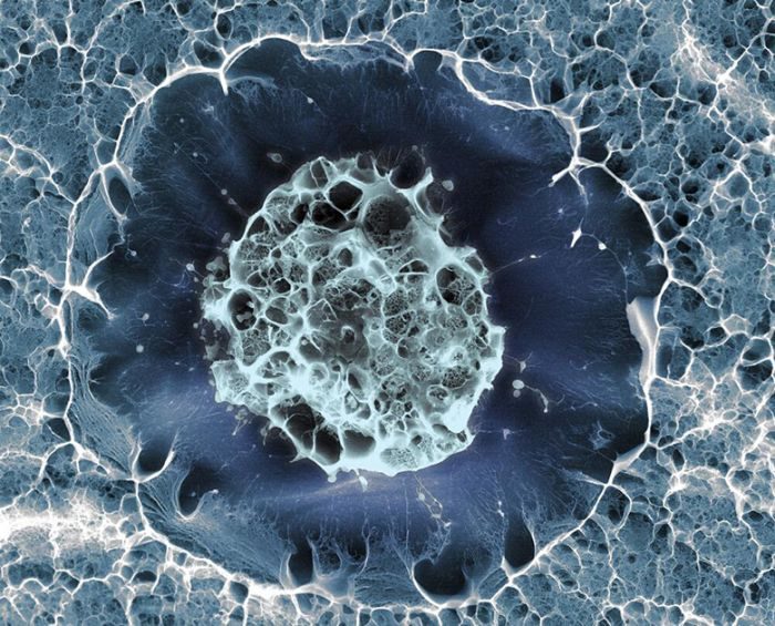 Стволовая клетка, взятая из организма здорового человека, пожертвовавшего часть своего костного мозга на нужды раковых больных. Для сохранения естественной среды клетки ее быстро заморозили до минус 150 по Цельсию — а затем сфотографировали в криогенном сканирующем электронном микроскопе.